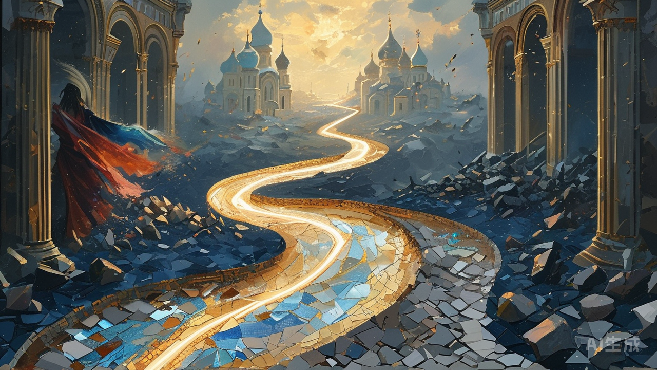 西隅蓦然传来一声清泠的笑。无数小石、琉璃、金箔组成的马赛克,在暮光里折射出细碎幽光,宛若星空碎裂坠落于人间。它们彼此嵌合,以精密几何阵列构筑出飞鸟、藤蔓或抽象的光之河流,华丽如拜占庭的耳语。“老家伙,你又何尝懂得?”无数细小的声音似溪流汇聚,“我们正是万千碎片的意志,于尘屑中铺展辉煌。风雨?呵,它只会让我们的颜色交融更深。” 粗犷者不屑地抖动身躯,簌簌落下些石粉:“永恒?那才叫壮美!” “可我们正是‘此刻’最明亮的诗篇。” 马赛克柔声回击,每一片都像在诉说,“每一粒皆是世界微缩的镜像,每一次拼嵌都是瞬间与永恒的契约。”