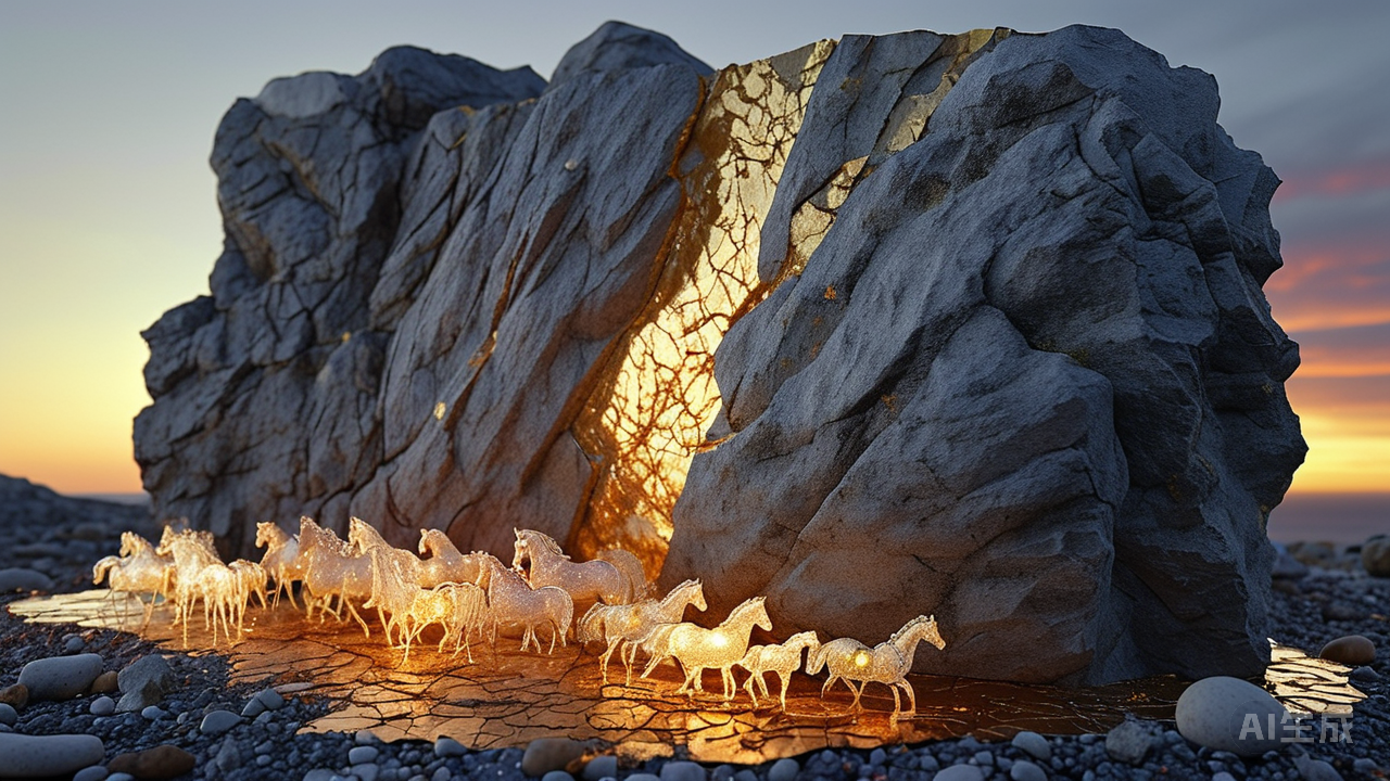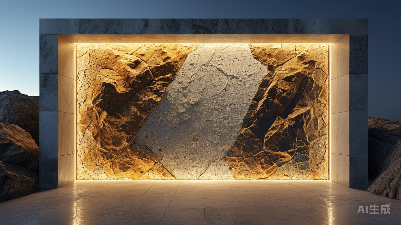 粗犷岩石板与精致马赛克的对话,塑造充满戏剧张力的墙面。黄昏的熔金缓缓漫过巨大墙面,此地俨然一座古老剧场的残骸。东隅一角,粗砺如断崖的岩石板,黑褐身躯上密布着风霜雕凿的伤痕。它兀然矗立,棱角如战斧劈砍的痕迹,如同天地初开时未驯服的脊骨,粗莽中自有不可折的筋骨。 “看你们!”岩石板的声音低沉如地底熔岩,“细碎得仿佛孩童的积木!能承受几场风雨?”