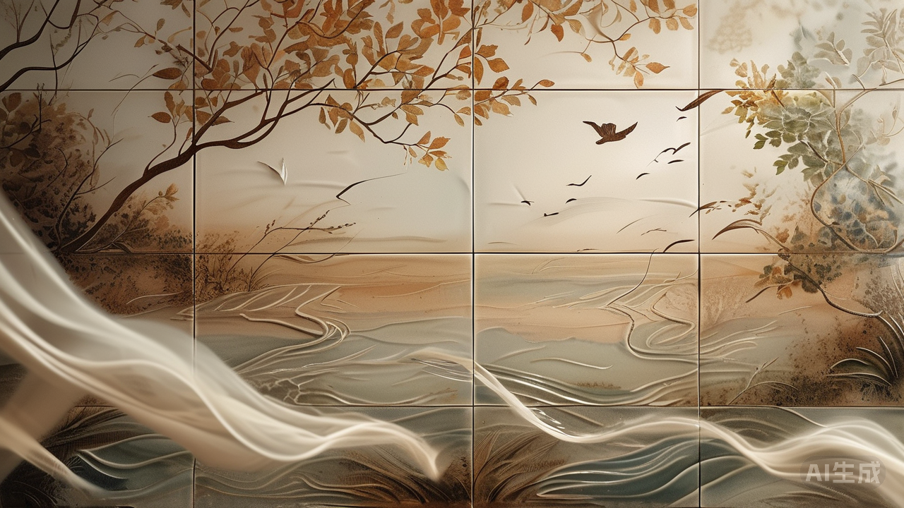 自然之形,亦能被抽象提炼为瓷砖上的诗意符号。一片舒展的树叶脉络被精巧定格,水波的涟漪在釉面下荡漾开去,或是一羽飞鸟的剪影掠过素砖一角……这些简约而灵动的意象,在铺贴间交织成趣。它打破整齐网格的单调,使空间不再只是静物,而仿佛拥有微风拂过的微颤。当目光掠过,便觉有清风徐来、水声潺潺,自然轻盈的呼吸便在方寸间流淌。
